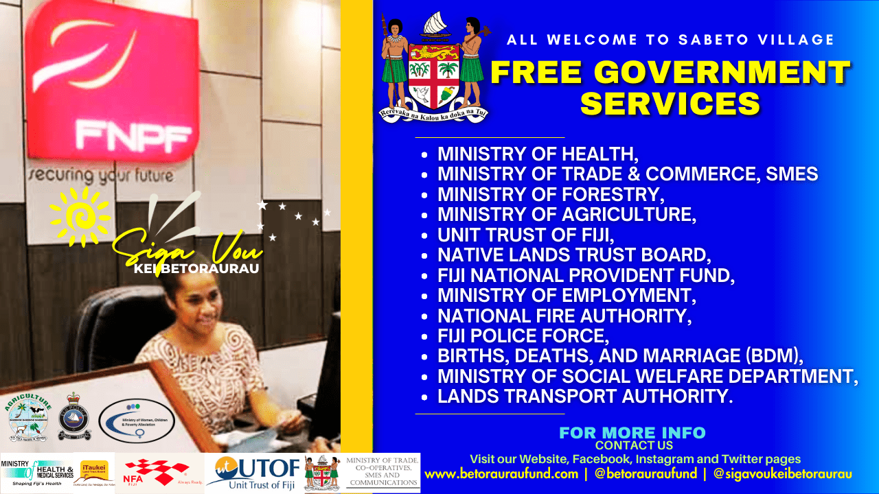 The Fijian Government Roadshow program will be at Sabeto village for the Siga Vou kei Betoraurau and everyone is welcome to access all government services. Various ministries including Health, Ministry of Trade & Commerce, Forestry, Agriculture, Unit Trust of Fiji, NLTB, FNPF, Ministry of Employment, National Fire Authority, Fiji Police Force, Births, Deaths, and MarriageContinue reading “Everyone is welcome to the Government Roadshow at Sabeto Village during Siga Vou kei Betoraurau”